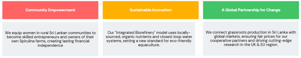 We are establishing a network of community-owned, women-led cooperatives in Sri Lanka to sustainably cultivate high-grade Spirulina.